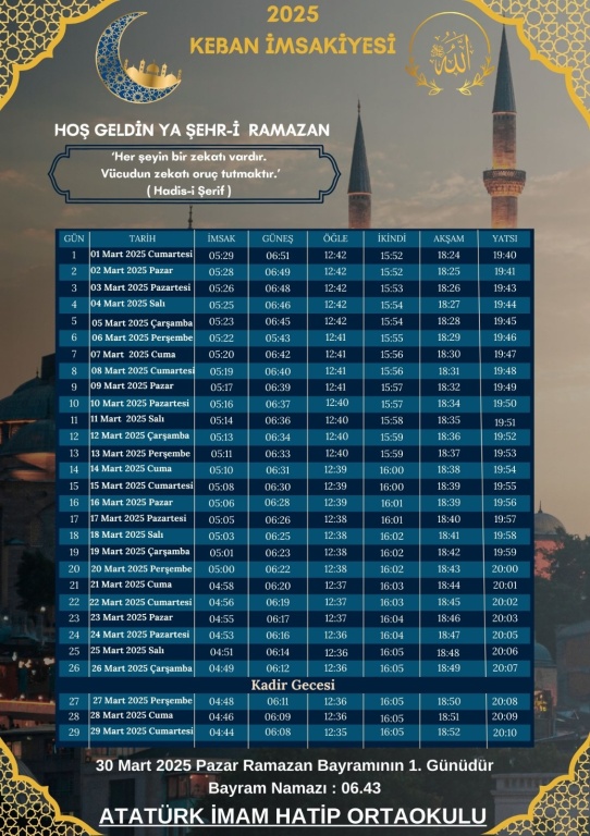 Yaklaşan mübarek Ramazan ayı dolayısıyla okulumuz adına Ramazan İmsakiyesi düzenlendi. Bütün ümmetin Ramazan ayını tebrik eder, islamin izzetine, müslümanlarında kurtuluşlarına vesile olmasını cenab-ı haktan niyaz ederiz.